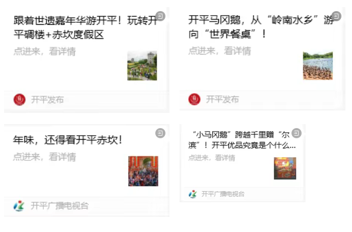 長期以來,開平市新聞宣傳工作以本地媒體市融媒體中心、南方報(bào)業(yè)傳媒集團(tuán)(南方日報(bào)社)江門分社、江門日報(bào)開平記者站等上級主流媒體,以及各部門、單位政務(wù)新媒體為主力軍,不斷強(qiáng)化正面輿論引導(dǎo),拓寬傳播開平聲音的渠道。自實(shí)施“百千萬工程”以來,開平市堅(jiān)持發(fā)揮媒體的信息傳播、資源整合、品牌塑造、輿論引導(dǎo)等功能,打造了開平碉樓、赤坎古鎮(zhèn)、開平馬岡鵝等知名IP,以及“開平優(yōu)品”行政區(qū)域品牌,使開平特色產(chǎn)品的曝光率、知名度、影響力顯著提升。