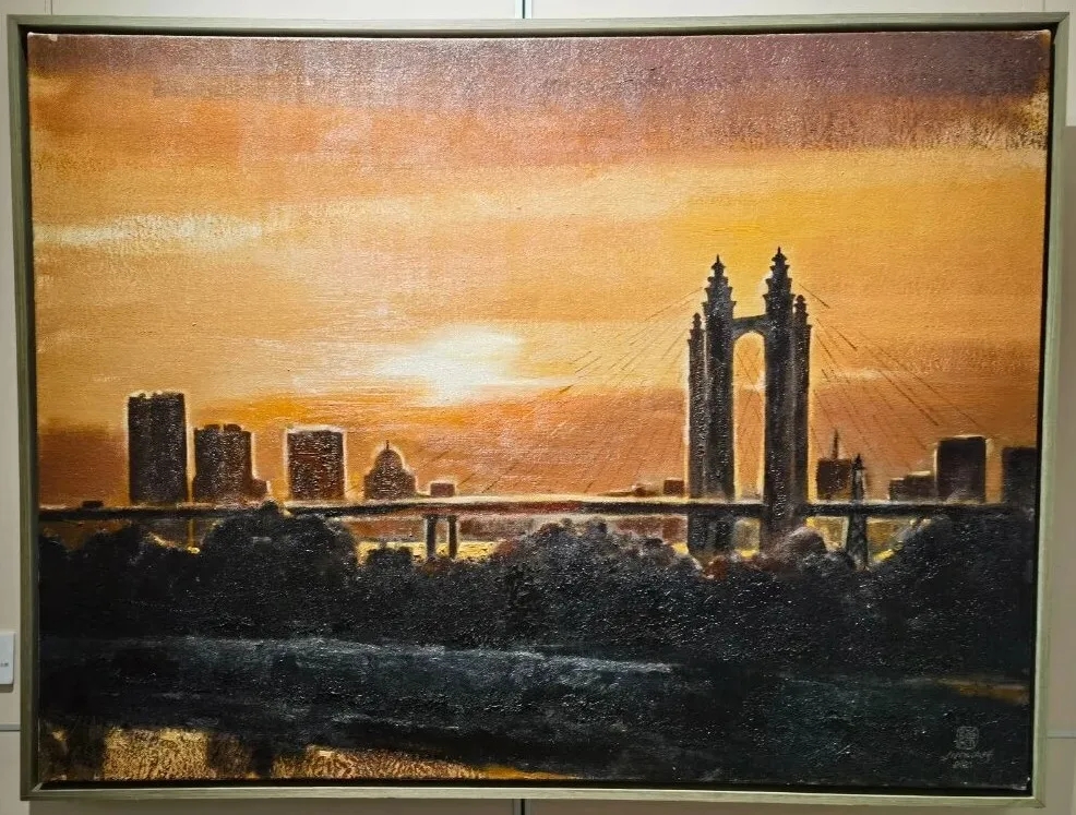 陳金賢出生于開平,作為致公黨黨員,他以僑鄉(xiāng)江門為創(chuàng)作母體,將“東方寫意表現(xiàn)主義”的筆墨神韻與西方油畫技法巧妙融合。他將江門賽龍舟、臺(tái)山洋樓村落、開平立園、赤坎華僑古鎮(zhèn)等江門重要景點(diǎn)、建筑、山水和人文,化作畫布上躍動(dòng)的色彩與光影,定格了僑鄉(xiāng)的自然之美與人文之韻,更以藝術(shù)語(yǔ)言表達(dá)致公黨“致力為公,僑海報(bào)國(guó)”精神。
