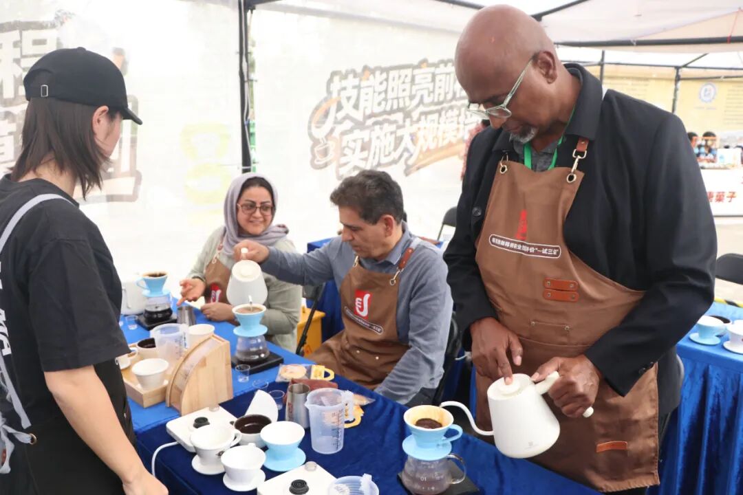 在大賽配套活動中,外國友人現(xiàn)場品咖啡、逛市集,了解先進咖啡設(shè)備,并在“即學(xué)即會”手沖咖啡公益課上體驗咖啡沖煮。