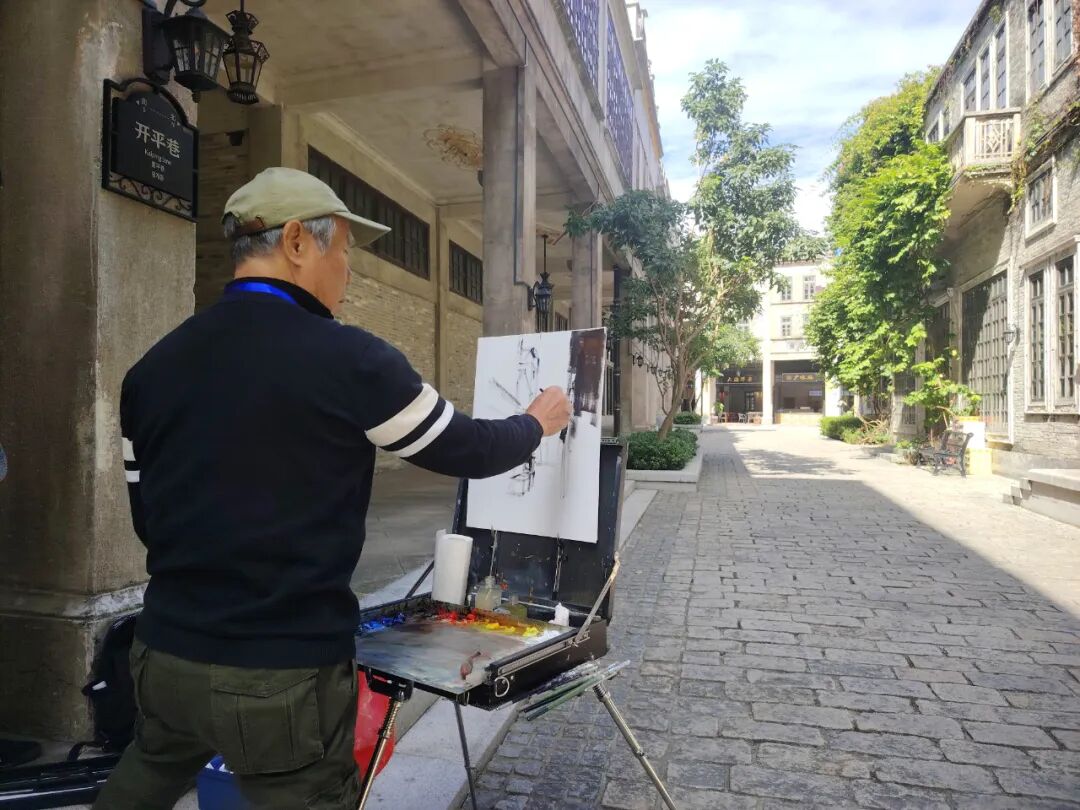 啟動儀式后,美術家們迅速進入創(chuàng)作狀態(tài)。在赤坎華僑古鎮(zhèn),大家分散于街巷各處,尋找自己心儀的視角,有人面對連片騎樓鋪展畫布,以油彩勾勒建筑風貌;也有畫家執(zhí)筆揮墨,以流暢線條捕捉市井煙火,力圖展現(xiàn)僑鄉(xiāng)建筑中西合璧的獨特神韻。