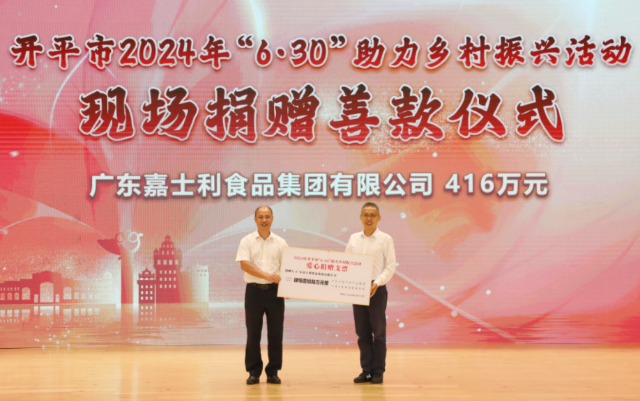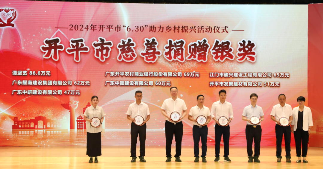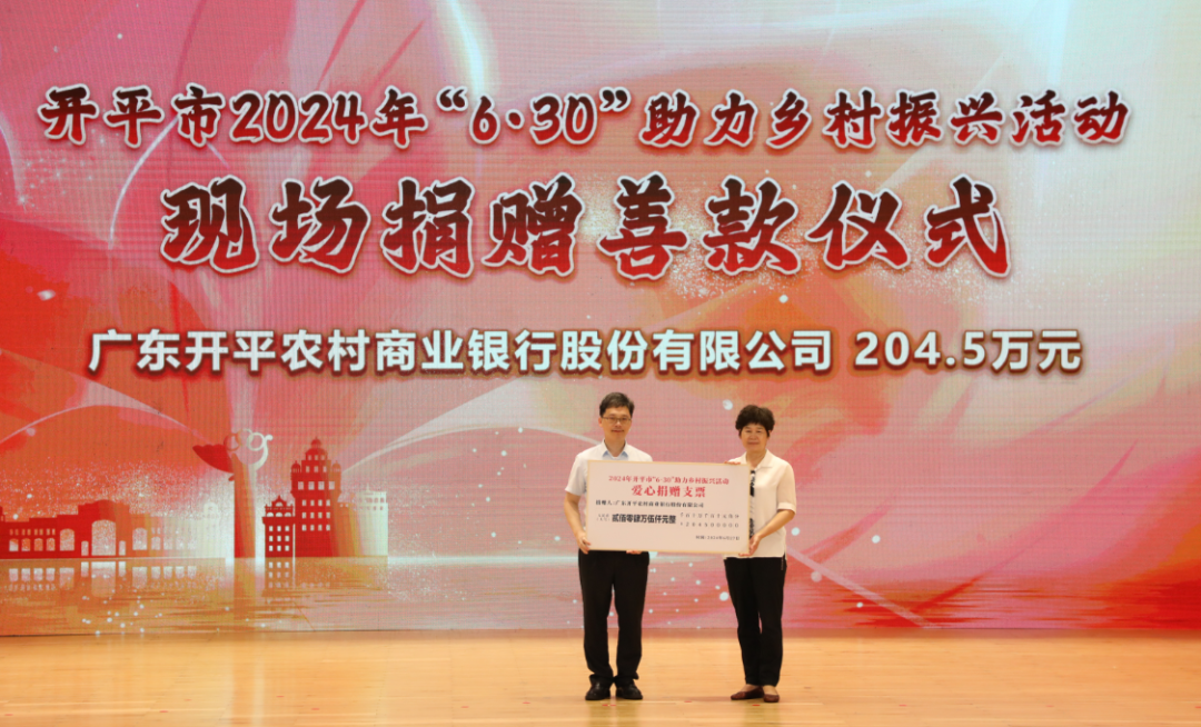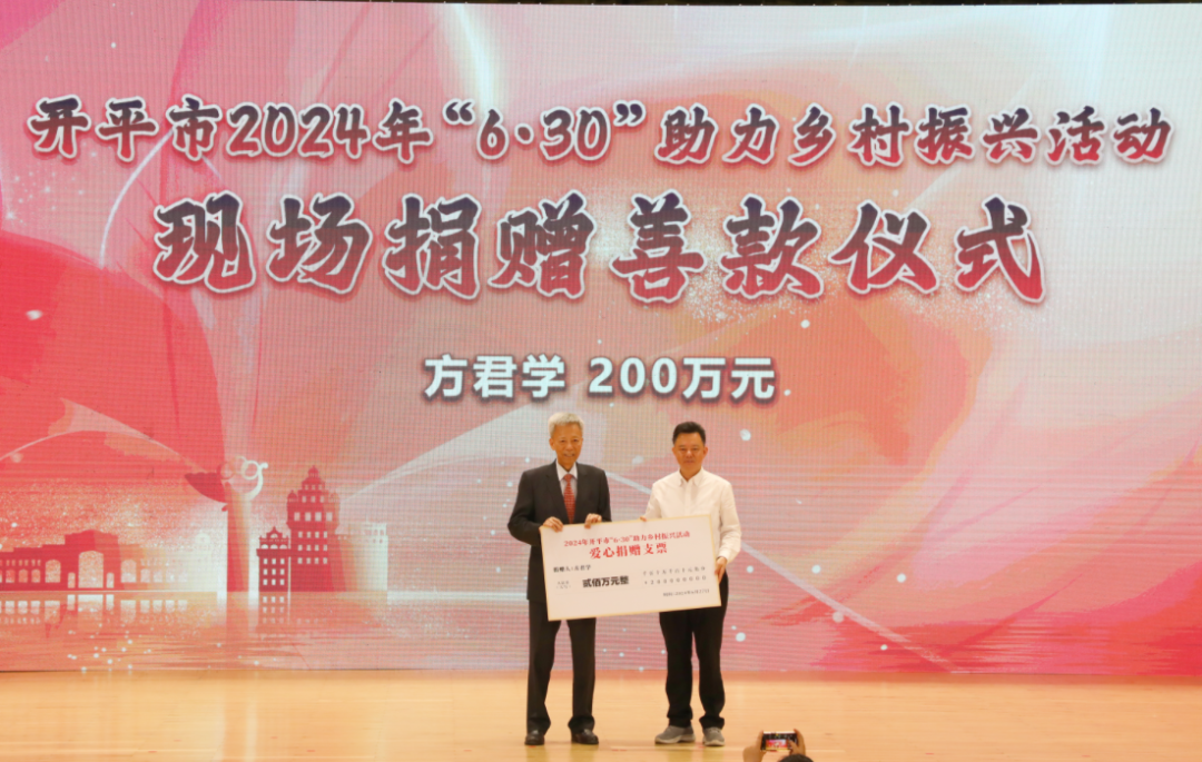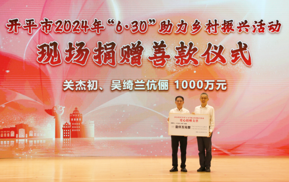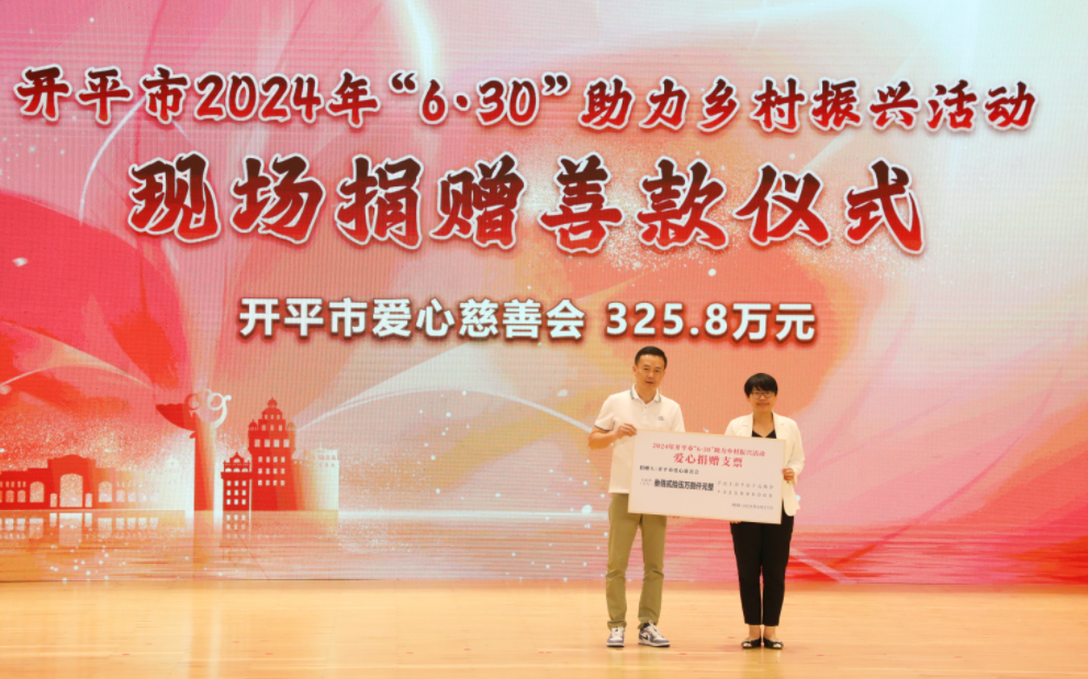 活動(dòng)現(xiàn)場舉行了2024年“6·30”助力鄉(xiāng)村振興活動(dòng)捐贈(zèng)(認(rèn)捐)儀式。熱心企業(yè)捐贈(zèng)2000萬元,關(guān)杰初、吳綺蘭伉儷捐贈(zèng)1000萬元,廣東嘉士利食品集團(tuán)有限公司捐贈(zèng)416萬元,開平市愛心慈善會(huì)捐贈(zèng)325.8萬元,廣東開平農(nóng)村商業(yè)銀行股份有限公司捐贈(zèng)204.5萬元,方君學(xué)先生捐贈(zèng)200萬元,現(xiàn)場進(jìn)行支票交接儀式。愛心企業(yè)、單位、社會(huì)團(tuán)體和個(gè)人、市四套班子領(lǐng)導(dǎo)成員紛紛上臺(tái)捐款獻(xiàn)愛心。