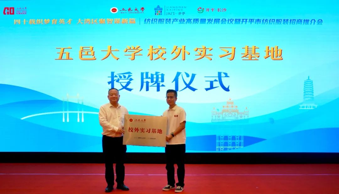 同時,開平市向五邑大學紡織科學與工程學院、開平市紡織服裝行業(yè)協(xié)會授予“招商合伙人”牌匾,精準賦能開平紡織產(chǎn)業(yè)鏈招商;五邑大學向開平市紅日制衣有限公司授予“五邑大學校外實習基地”牌匾,進一步促進人才培養(yǎng)與實踐教學的雙向融合。