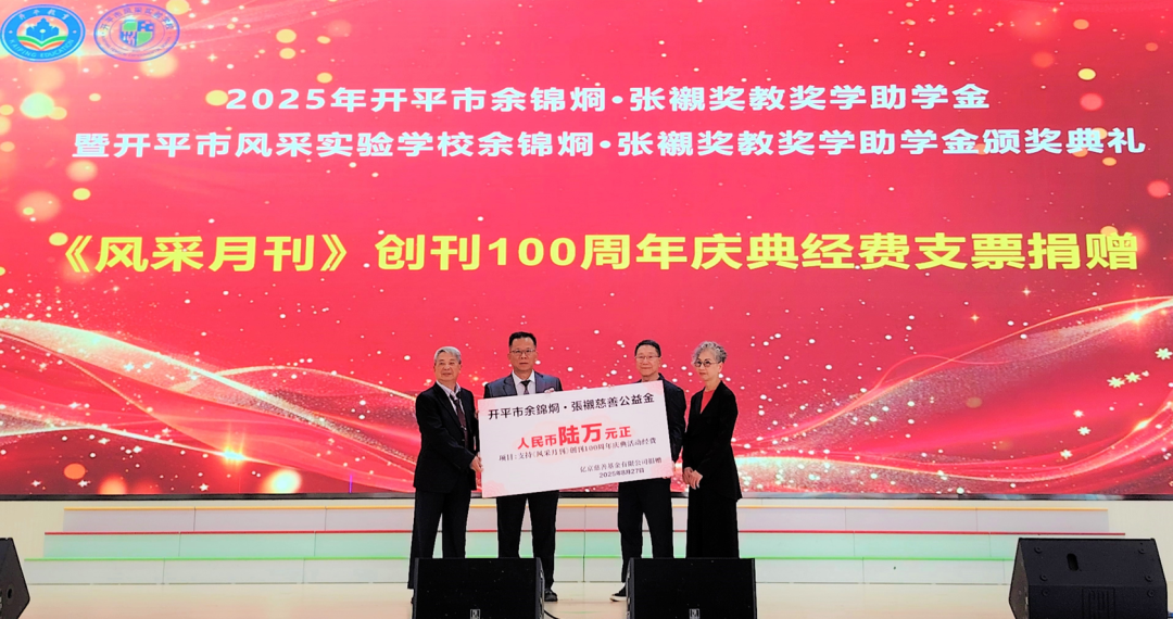 頒獎(jiǎng)儀式上,余卓兒先生伉儷捐贈(zèng)開平市風(fēng)采實(shí)驗(yàn)學(xué)校港幣8000萬元用于學(xué)校高中部項(xiàng)目建設(shè)、130萬元用于獎(jiǎng)教獎(jiǎng)學(xué)助學(xué),捐贈(zèng)開平市第一中學(xué)港幣10萬元資助清北班研學(xué)集訓(xùn)及培養(yǎng),捐贈(zèng)《風(fēng)采月刊》人民幣6萬元,用于創(chuàng)刊100周年慶典活動(dòng)。