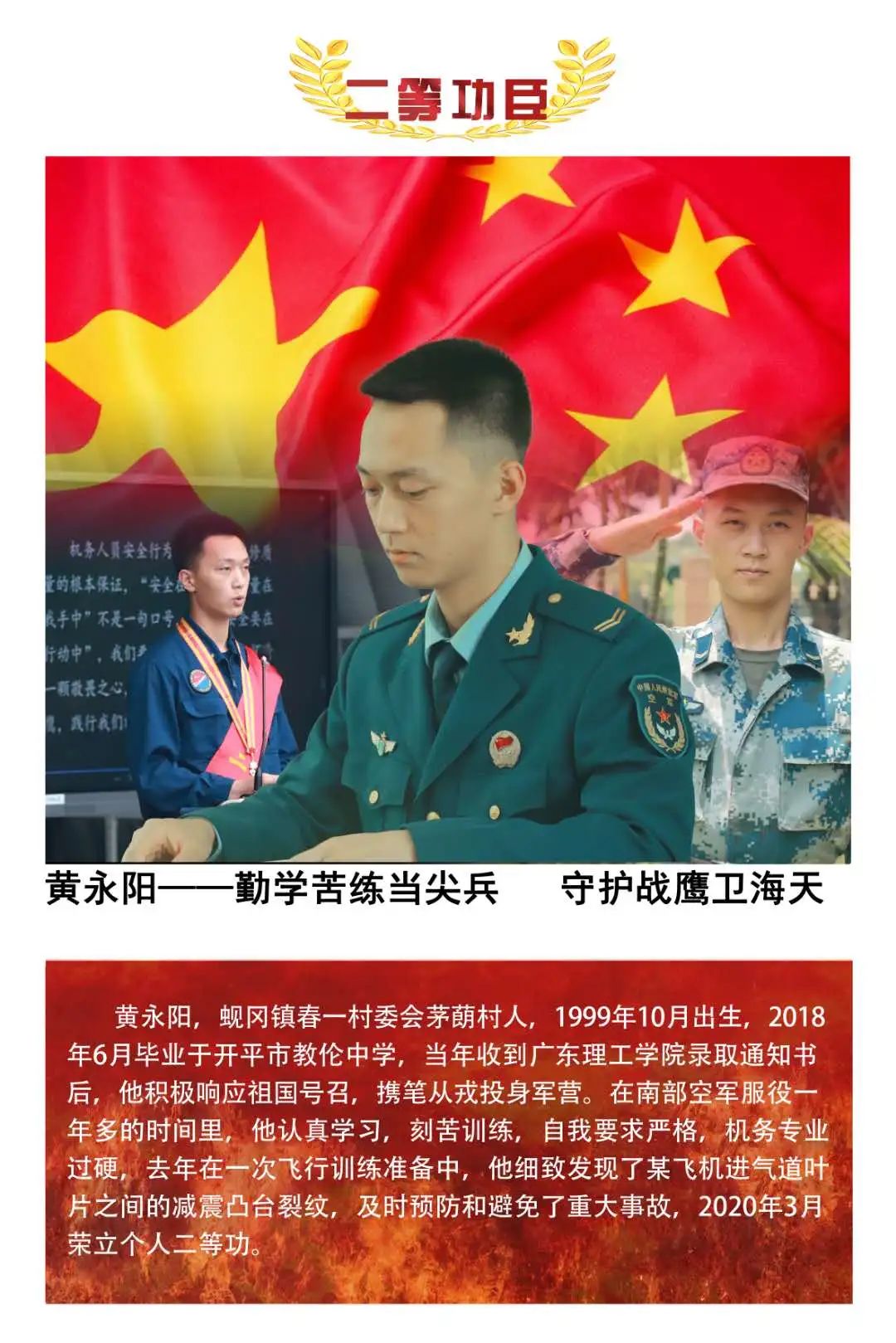 黃永陽(yáng)的發(fā)現(xiàn),預(yù)防和避免了事故,使國(guó)家、軍隊(duì)和人民群眾的利益免受損失,榮立二等功!作為一名航空機(jī)務(wù)兵,黃永陽(yáng)愛(ài)戰(zhàn)鷹、愛(ài)機(jī)場(chǎng),甘當(dāng)藍(lán)天鋪路石,爭(zhēng)做戰(zhàn)鷹守護(hù)神,堅(jiān)守崗位講奉獻(xiàn),精忠報(bào)國(guó)為強(qiáng)軍。