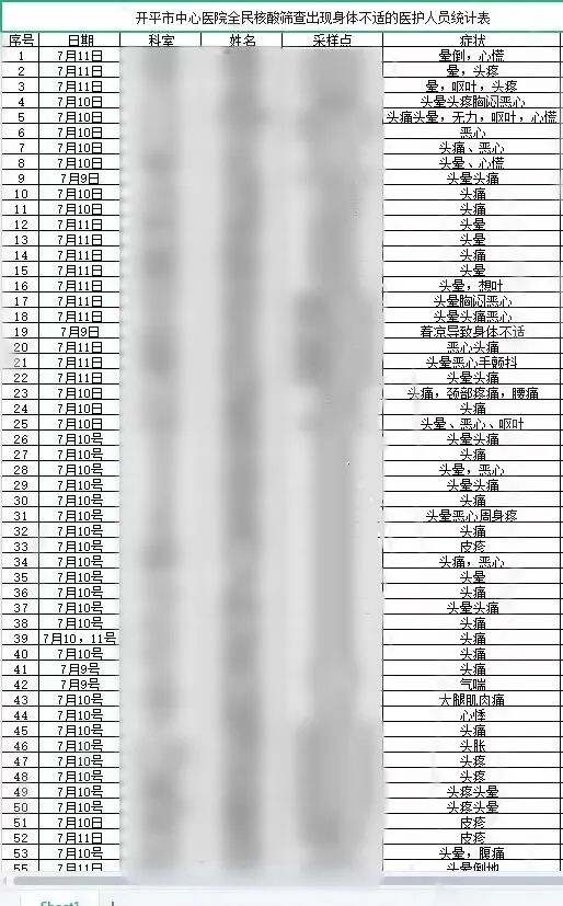 成功的背后離不開艱苦的付出和無我的奉獻(xiàn),下面這張圖截取的是一部分核酸采樣身體不適醫(yī)務(wù)人員統(tǒng)計(jì)表。
