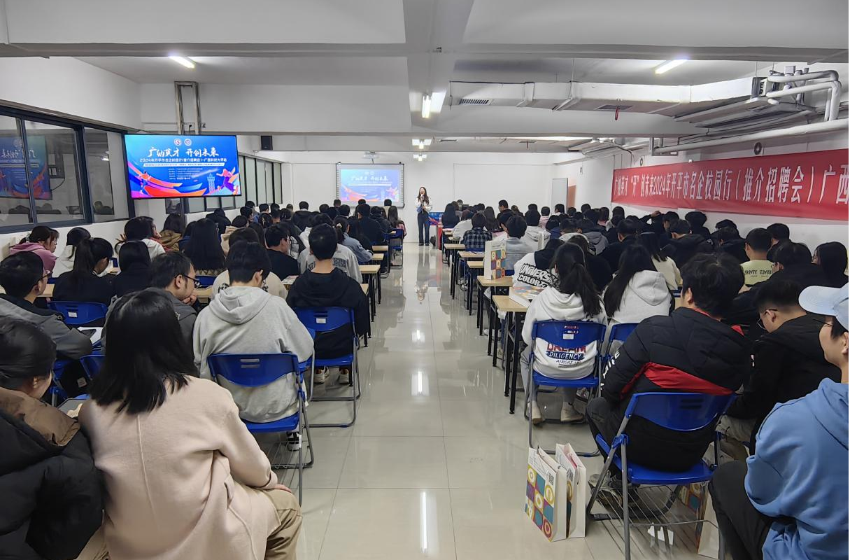 3月20日晚上,開平招聘團在廣西科技大學就業(yè)指導中心開展了宣講推介會,開平市委人才辦、市人社局有關負責人圍繞開平人文歷史、區(qū)位交通、產(chǎn)業(yè)集聚、人才政策等優(yōu)勢特點展開介紹,向廣西科技大學畢業(yè)生發(fā)出誠摯邀請,希望廣西科技大學學子選擇到開平就業(yè)發(fā)展、施展才華、實現(xiàn)青春夢想。隨后,開平市各重點企業(yè)代表也逐一上臺向同學們詳細介紹企業(yè)文化和福利待遇等,現(xiàn)場氣氛活躍。