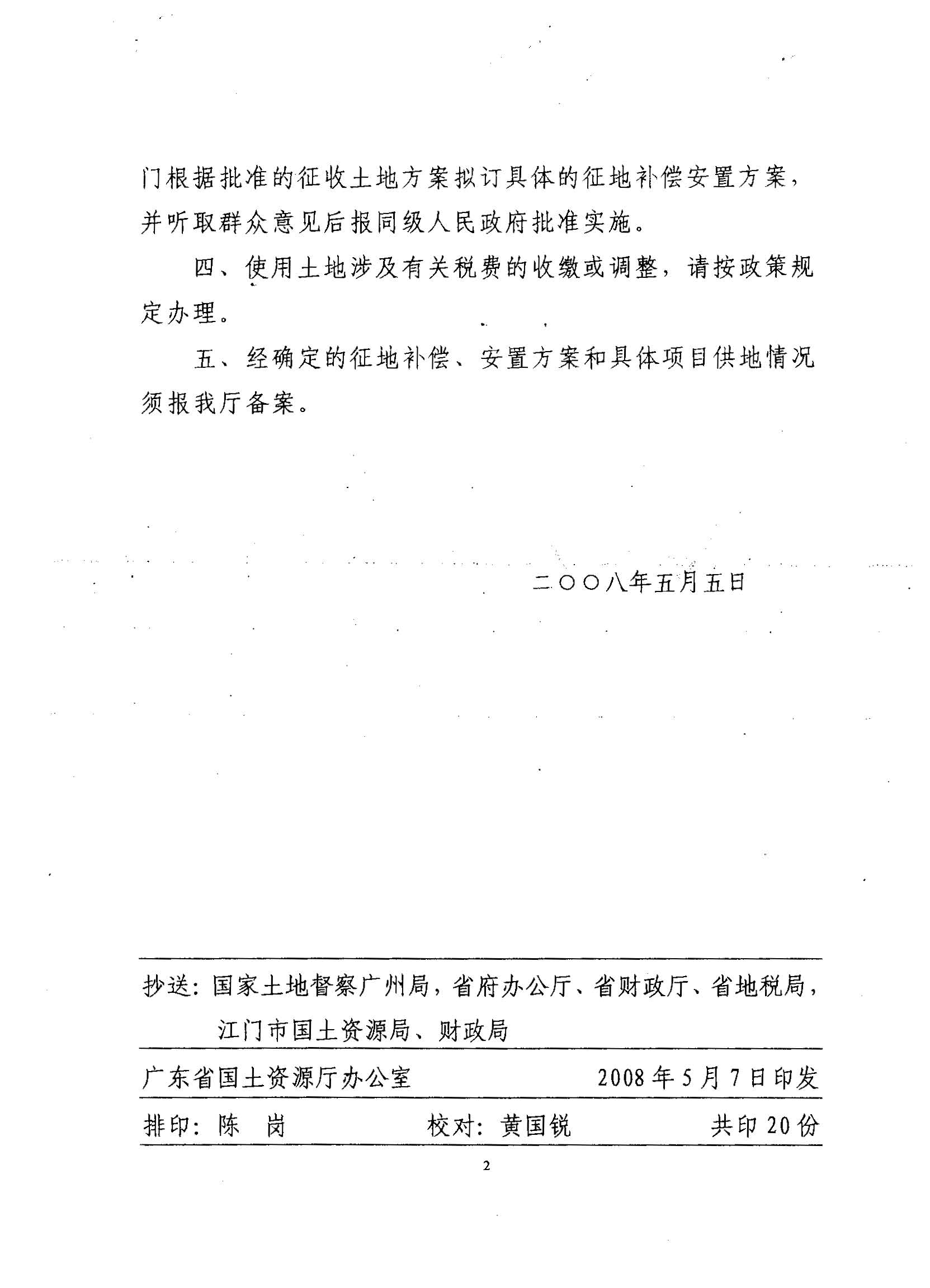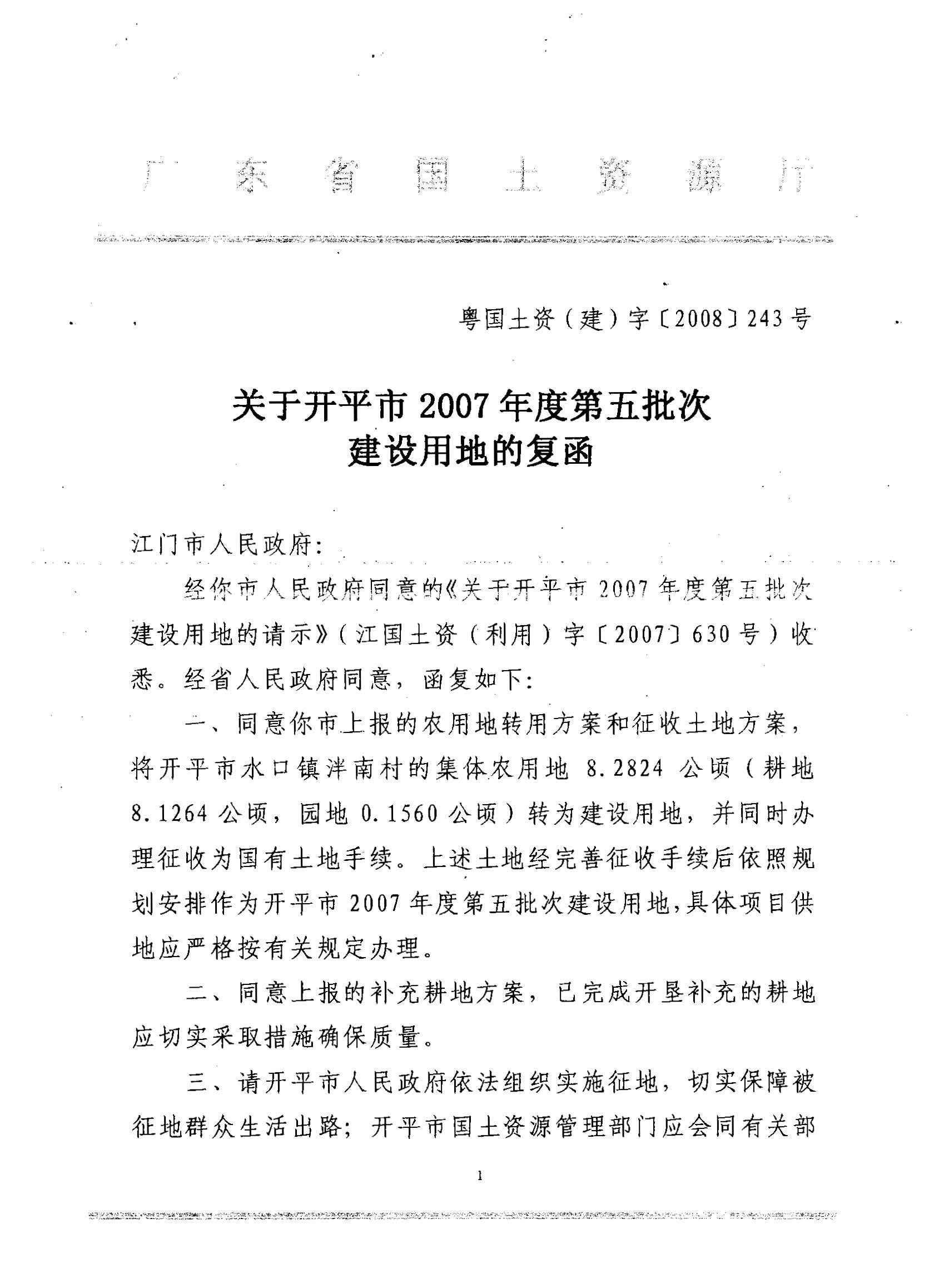 開(kāi)平市2007年度第五批次建設(shè)用地的復(fù)函
