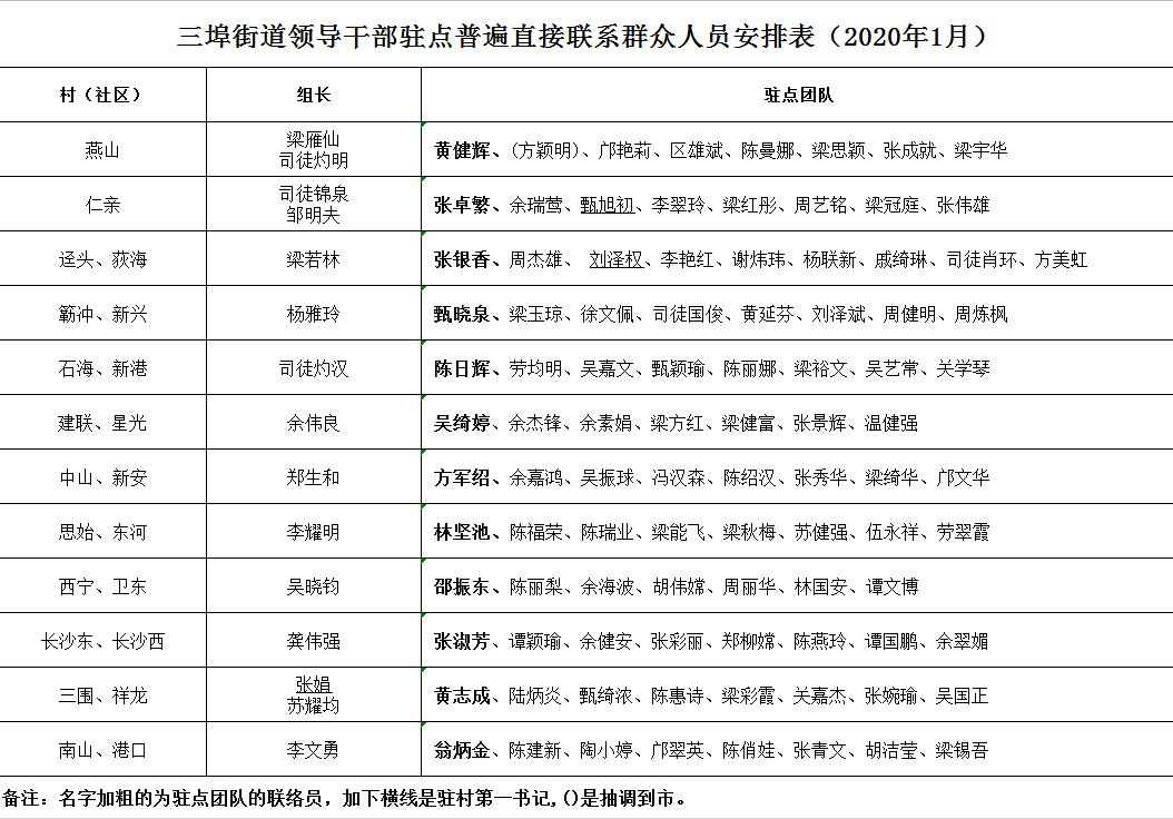三埠街道領(lǐng)導干部駐點普遍直接聯(lián)系群眾人員安排表(2020年1月)