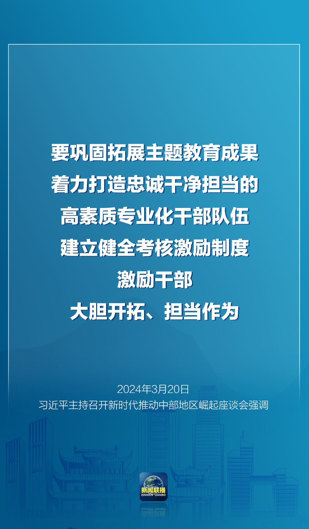 習(xí)近平最后強(qiáng)調(diào),中央?yún)^(qū)域協(xié)調(diào)發(fā)展領(lǐng)導(dǎo)小組要加強(qiáng)統(tǒng)籌協(xié)調(diào)和督促指導(dǎo),中央有關(guān)部門要加大支持力度,研究提出新時代推動中部地區(qū)崛起的政策舉措。地方黨委和政府要扛起主體責(zé)任,堅決貫徹黨中央決策部署,推動重點(diǎn)工作任務(wù)、重大改革事項落實落地。要鞏固拓展主題教育成果,著力打造忠誠干凈擔(dān)當(dāng)?shù)母咚刭|(zhì)專業(yè)化干部隊伍,建立健全考核激勵制度,激勵干部大膽開拓、擔(dān)當(dāng)作為。