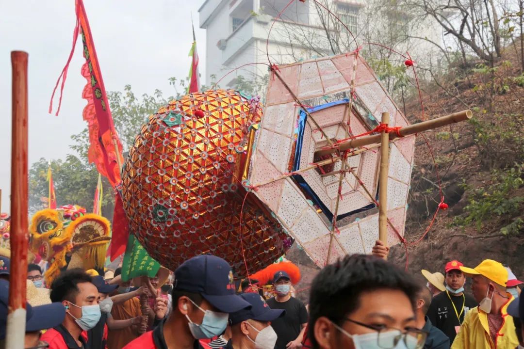 三盞巨大的花燈將沿著預(yù)定路線,途經(jīng)全鄉(xiāng)各個村莊,最終分別抵達(dá)三個專門選定的村落進(jìn)行“打燈”儀式,整個燈會活動也進(jìn)入了尾聲。約莫傍晚7時,永安村委會下屬的塘唇村成為了三個打燈地的其中一個焦點,這里上演了燈會上最后并且最為激動人心的一幕。伴隨著滿天飛舞的炮竹聲,精心制作的花燈被戳破,村民們蜂擁而至,競相搶奪燈紙和燈篾,期望以此作為帶回家的福氣象征,帶來家畜繁榮和家人平安。