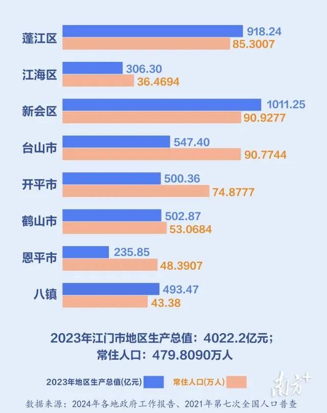 比如,八鎮(zhèn)面積加起來是748.54平方公里,占全市的7.8%,比蓬江區(qū)(324.3)和江海區(qū)(109.16)要大2至7倍。又比如,八鎮(zhèn)的常住人口有43.38萬人,占全市的8.7%,與江海區(qū)、恩平市都相差不遠。