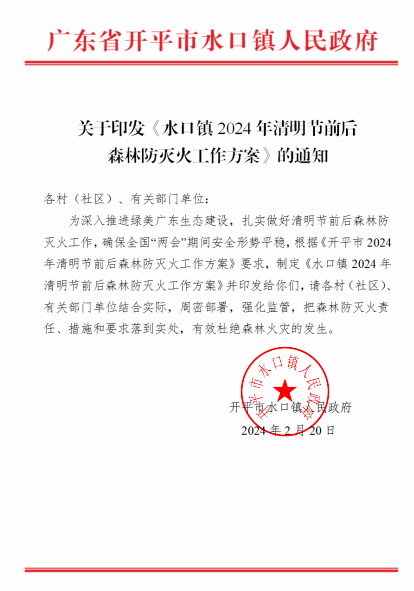 鎮(zhèn)黨委、政府高度重視,及時(shí)召開清明節(jié)前森林防滅火專題會(huì)議,印發(fā)《水口鎮(zhèn)2024年清明節(jié)前后森林防滅火工作方案》,對(duì)清明節(jié)期間森林防滅火和安全生產(chǎn)工作進(jìn)行安排部署并提出具體要求,嚴(yán)格落實(shí)領(lǐng)導(dǎo)帶班和24小時(shí)專人值班制度,做到“山有人管、林有人護(hù)、火有人防、責(zé)有人擔(dān)”。
