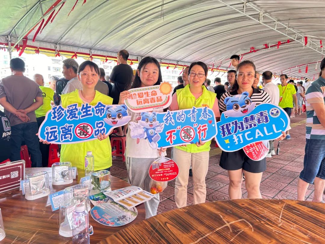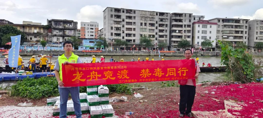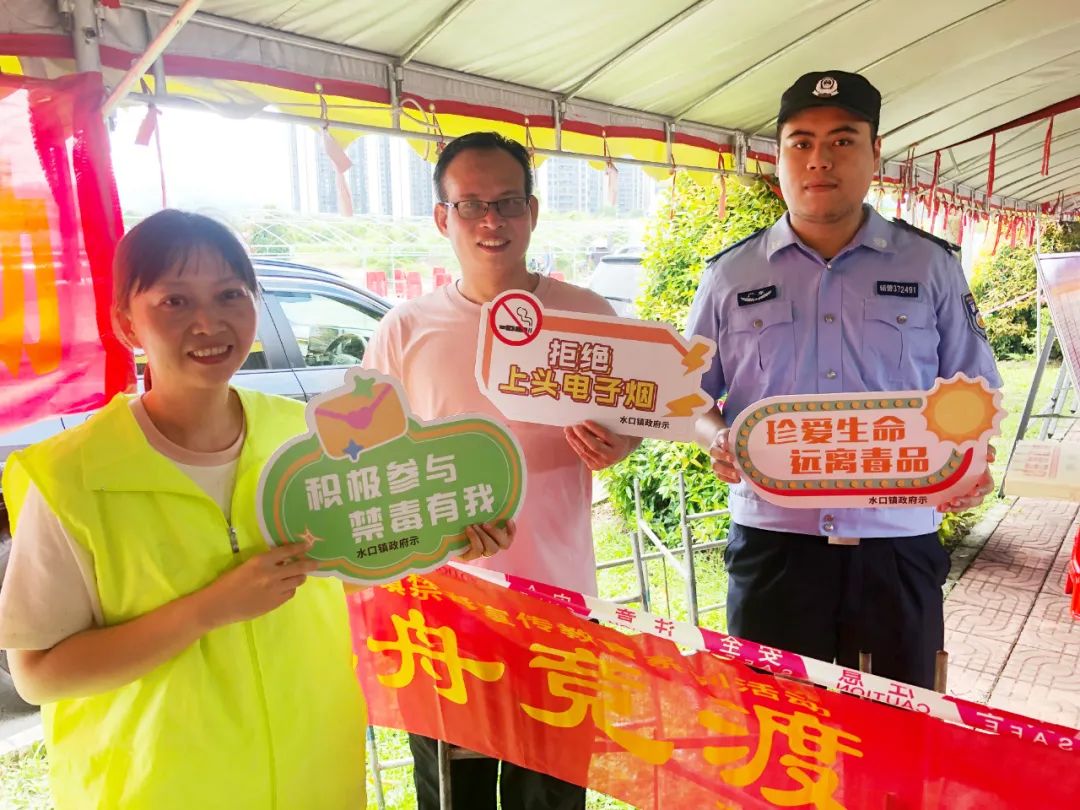 在保障龍舟活動(dòng)順利進(jìn)行的同時(shí),水口鎮(zhèn)網(wǎng)格員充分利用節(jié)日熱鬧氛圍,聯(lián)合鎮(zhèn)禁毒辦、水口派出所、開平市昭宇社會(huì)綜合服務(wù)中心開展“龍舟競(jìng)渡,禁毒同行”禁毒主題宣傳活動(dòng)。