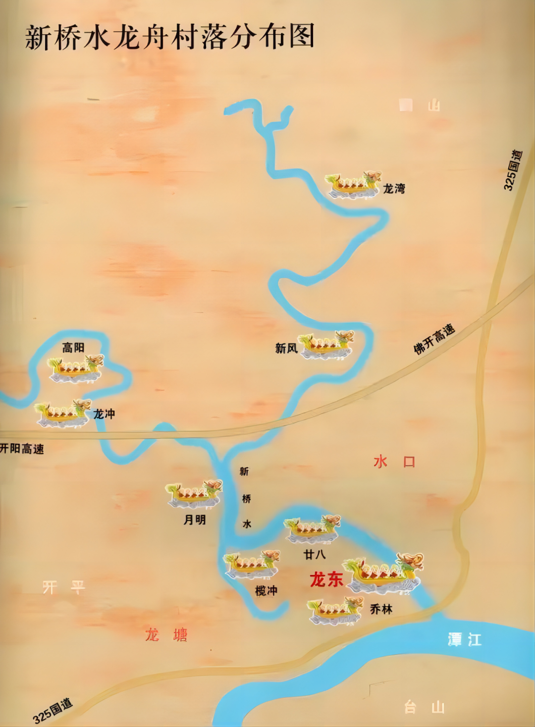 一是水口龍東龍舟。從地圖上看,古老的潭江支流——新橋水河道曲折,拱抱龍?zhí)链蟮?,形成“二龍戲珠”的格局,古人便將此地命名“龍?zhí)痢薄K阪?zhèn)龍東村委會位于開平水口龍?zhí)翓|部,正所謂“靠水吃水”,龍?zhí)寥耸来运疄樯?,投身于“行船”工作,培育了龍東男子自幼便在水上活動的習性,也讓龍?zhí)寥嗣裥纬僧a生了對“龍”的崇拜。為祈求風調雨順、國泰民安,也為了向全族人展示本村的團結和實力,“扒龍舟”風尚興起,并逐漸發(fā)展成為最重要的民俗活動之一。