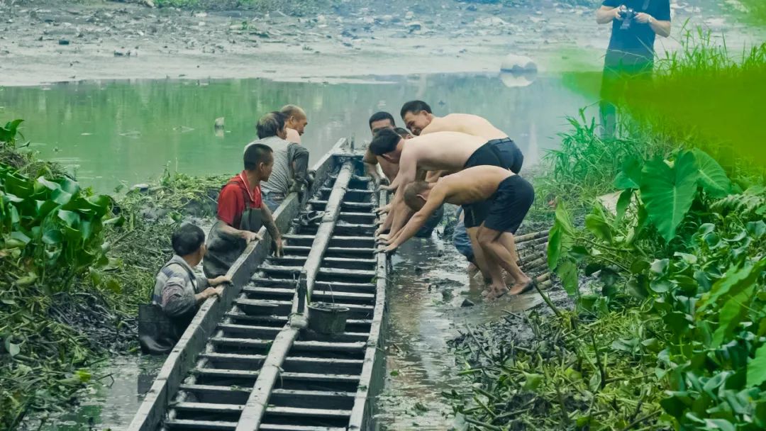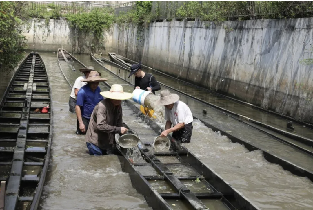 “起龍”儀式是賽龍舟的一個重要儀式。每年端午節(jié),傳統龍舟完成競渡后,都會置于水中“沉睡”,直至第二年四月初八完成轉龍頭儀式之后,各擁有龍舟的村莊便會選定吉日,趁潮退之時,將沉到河涌下的龍舟“喚醒”,“請”出水面,謂之“起龍”。起水后的龍舟要清理水生植物和淤泥,再用稻草等把船身里外洗擦干凈。隨后還要進行一系列的如補灰、打磨、上漆、調龍根等維修工序,沉睡一年的龍舟便可恢復往日雄風。