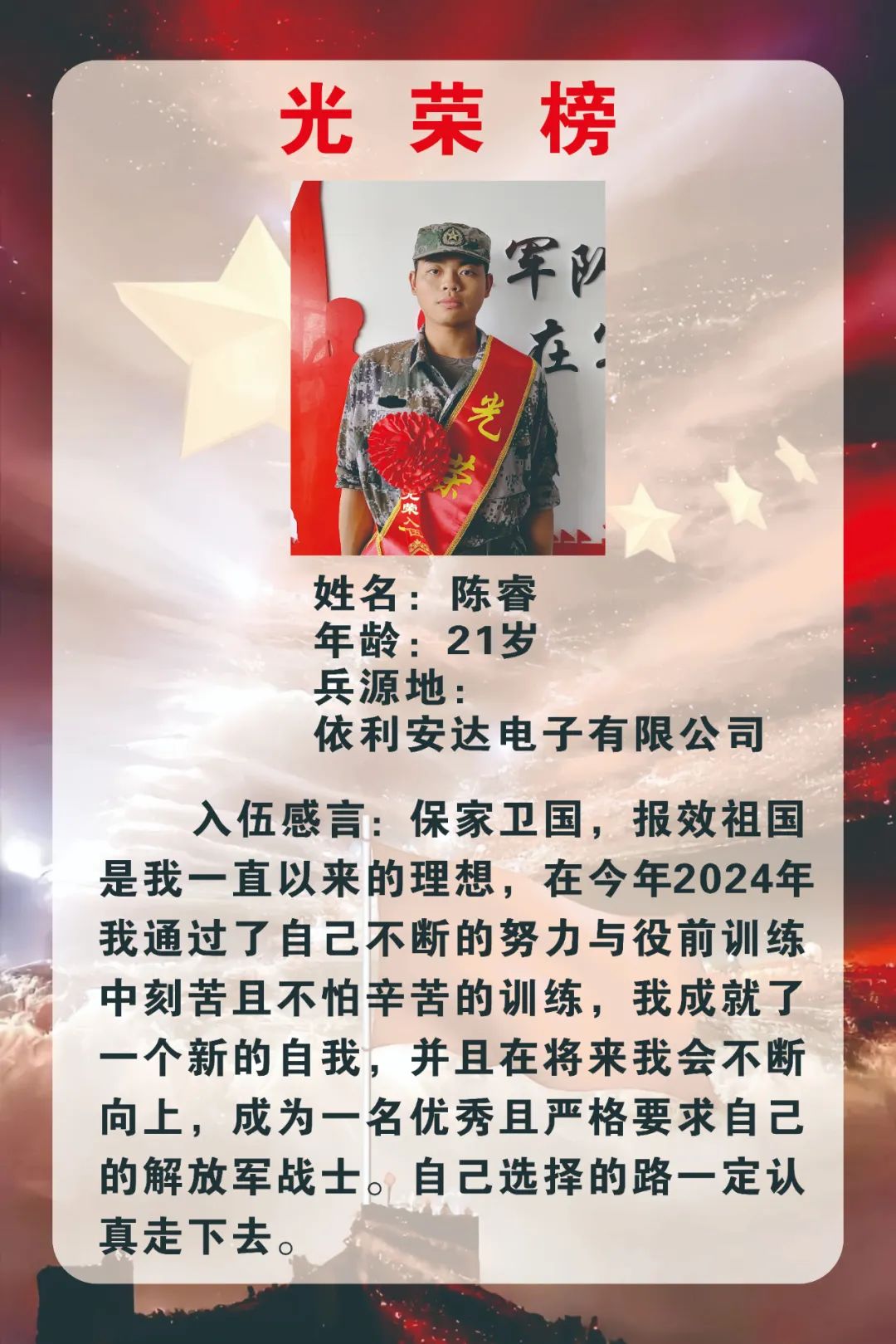 在此輪征兵工作中,開平依利安達電子有限公司廣泛動員滿足條件的青年員工踴躍報名參軍。經過層層篩選,最終2名大學生員工懷揣滿腔熱血與豪情奔赴軍營,踏上保家衛(wèi)國新征程。