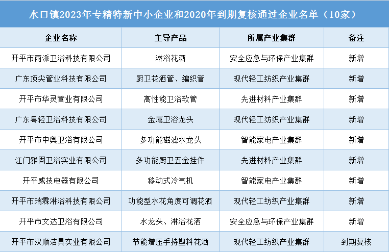 1月8日,廣東省工業(yè)和信息化廳公布2023年專精特新中小企業(yè)和2020年到期復(fù)核通過企業(yè)名單,水口鎮(zhèn)申請(qǐng)專精特新中小企業(yè)認(rèn)定(含到期復(fù)核1家)企業(yè)共10家,全部通過認(rèn)定審核。截至目前,水口鎮(zhèn)擁有省級(jí)專精特新中小企業(yè)企業(yè)24家(水暖衛(wèi)浴19家),數(shù)量居全市第一。