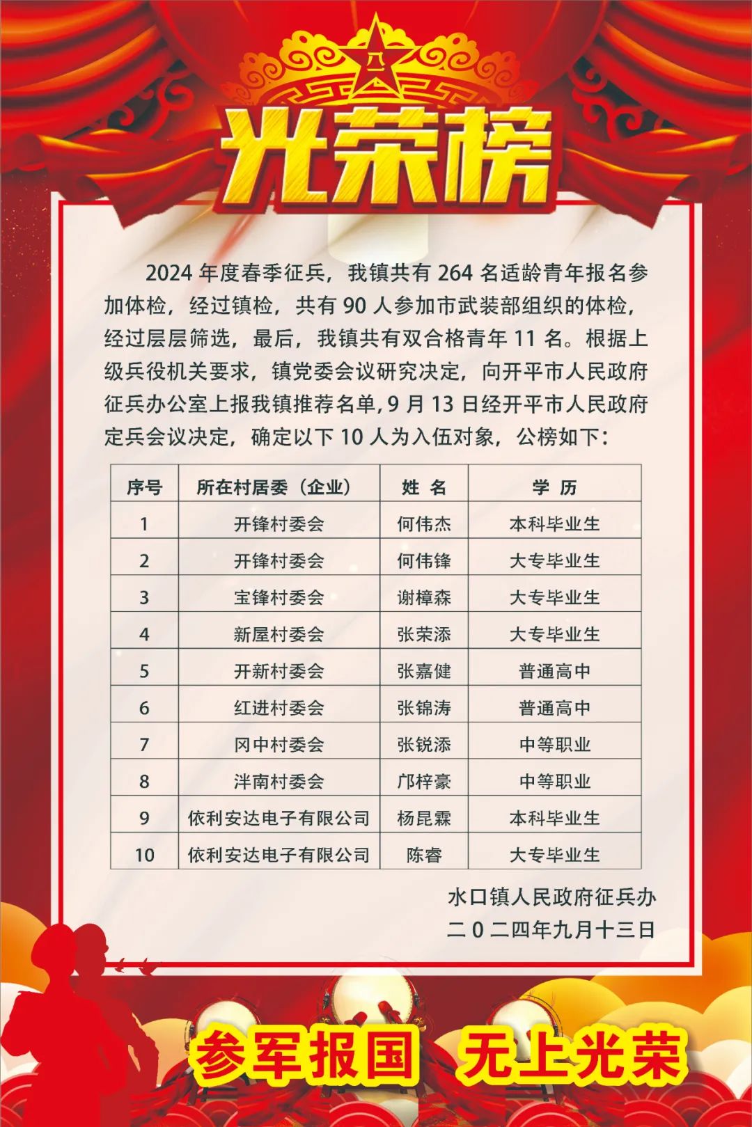 2024年春季征兵,水口鎮(zhèn)共有146名適齡青年報(bào)名應(yīng)征青年積極響應(yīng)國(guó)家號(hào)召,參加征兵體檢,接受嚴(yán)格挑選。經(jīng)過體檢、政考、定兵等環(huán)節(jié),水口鎮(zhèn)共有16名優(yōu)秀青年光榮入伍。