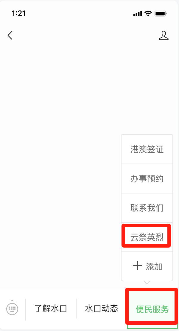 方式一,點擊開平水口微信公眾號首頁菜單欄右下方的【便民服務】—【云祭英烈】,進入云祭掃平臺。