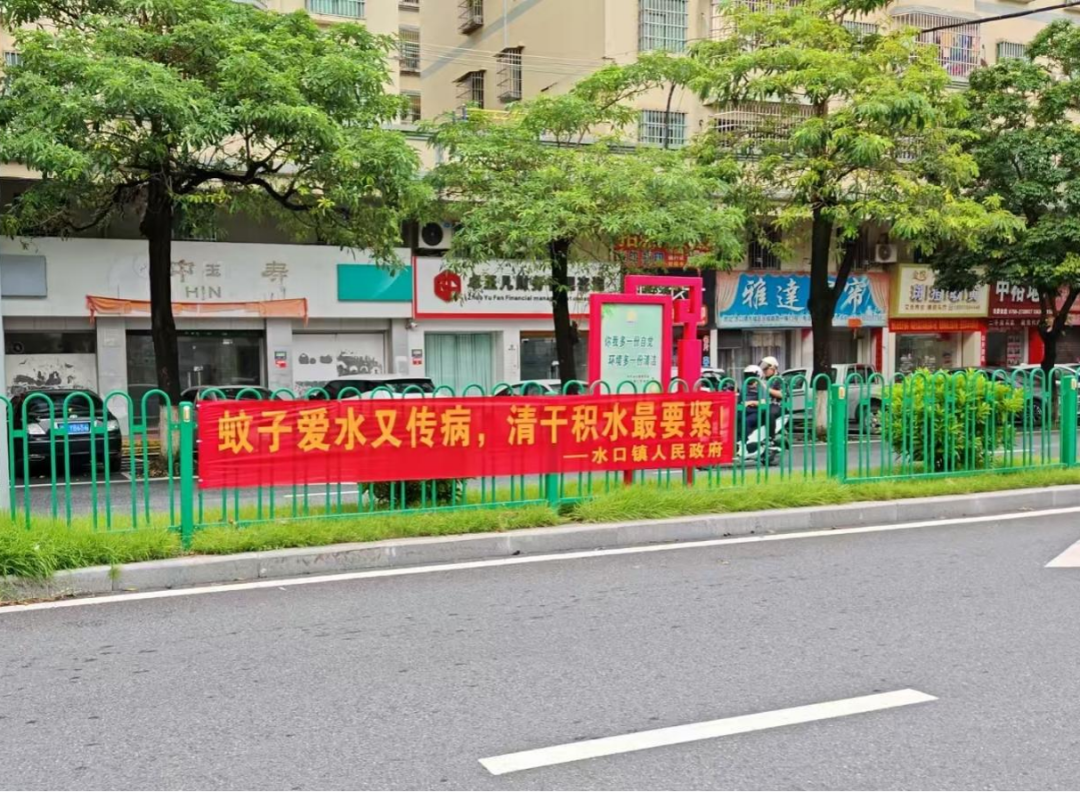 “兩熱”防控不是單打獨(dú)斗,需要廣大居民群眾的共同參與。水口鎮(zhèn)采取“線上+線下”“視覺(jué)+聽覺(jué)”的立體宣傳模式,讓防控防線越織越密。