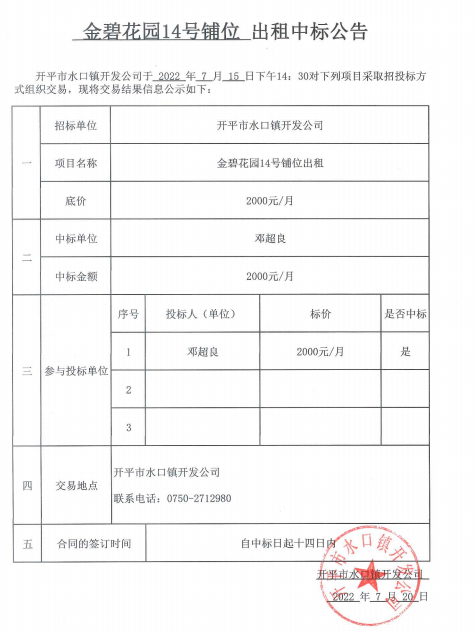 金碧花園14號(hào)鋪位出租中標(biāo)公告