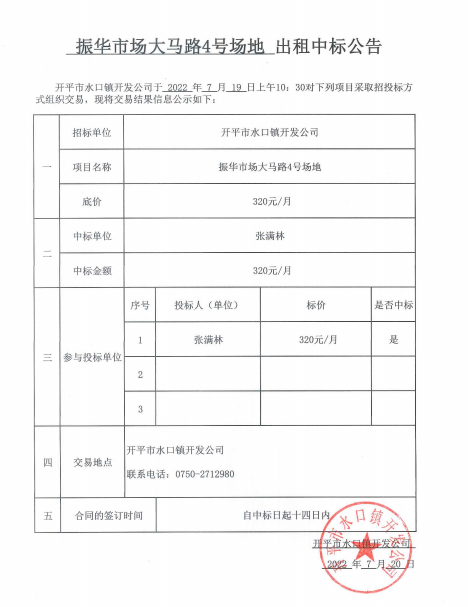 振華市場(chǎng)大馬路4號(hào)場(chǎng)地出租中標(biāo)公告