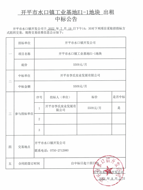 開平市水口鎮(zhèn)工業(yè)基地E1-1地塊出租中標(biāo)公告