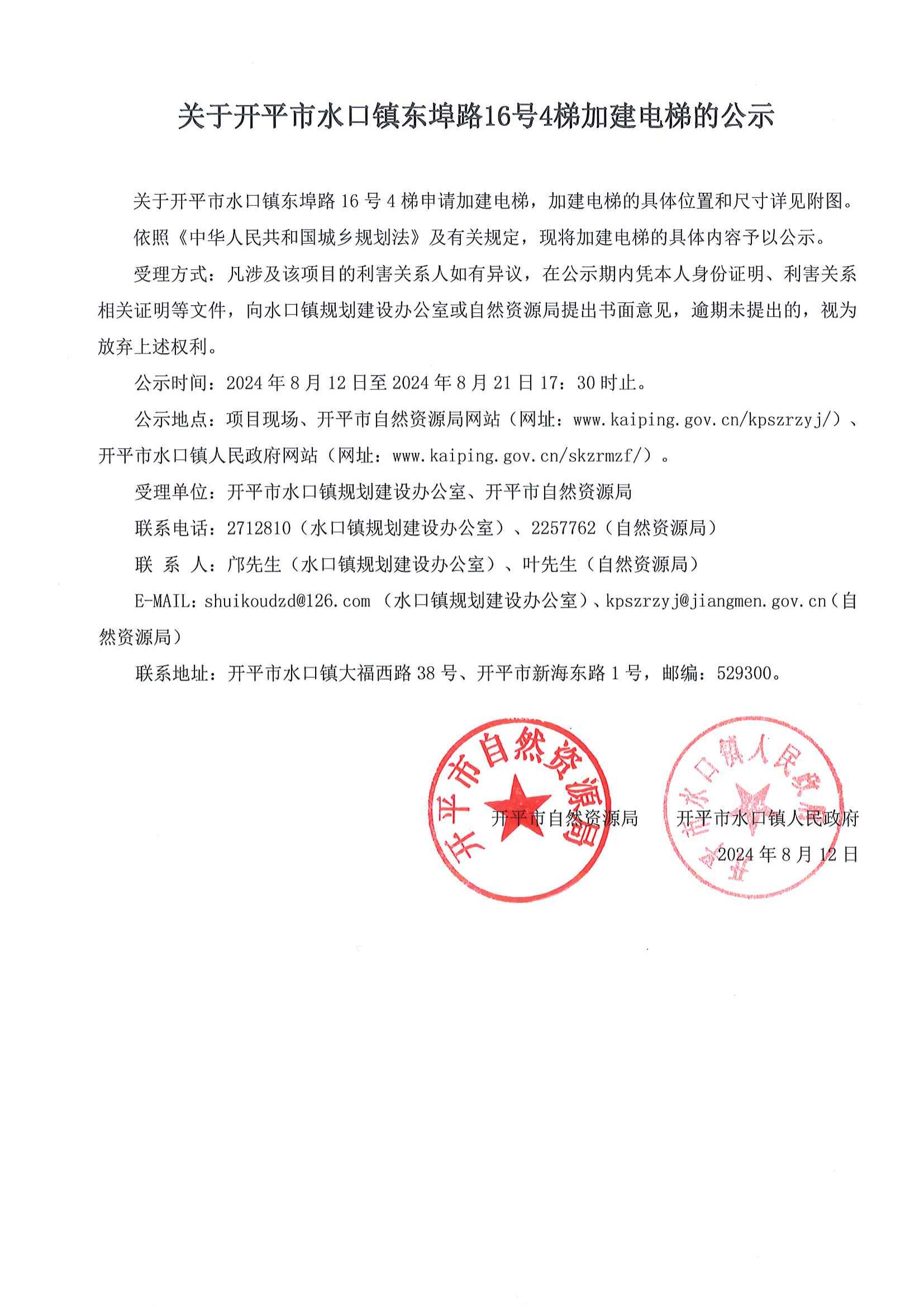關(guān)于開平市水口鎮(zhèn)東埠路16號4梯申請加建電梯,加建電梯的具體位置和尺寸詳見附圖。依照《中華人民共和國城鄉(xiāng)規(guī)劃法》及有關(guān)規(guī)定,現(xiàn)將加建電梯的具體內(nèi)容予以公示。受理方式:凡涉及該項目的利害關(guān)系人如有異議,在公示期內(nèi)憑本人身份證明、利害關(guān)系相關(guān)證明等文件,向水口鎮(zhèn)規(guī)劃建設(shè)辦公室或自然資源局提出書面意見,逾期未提出的,視為放棄上述權(quán)利。