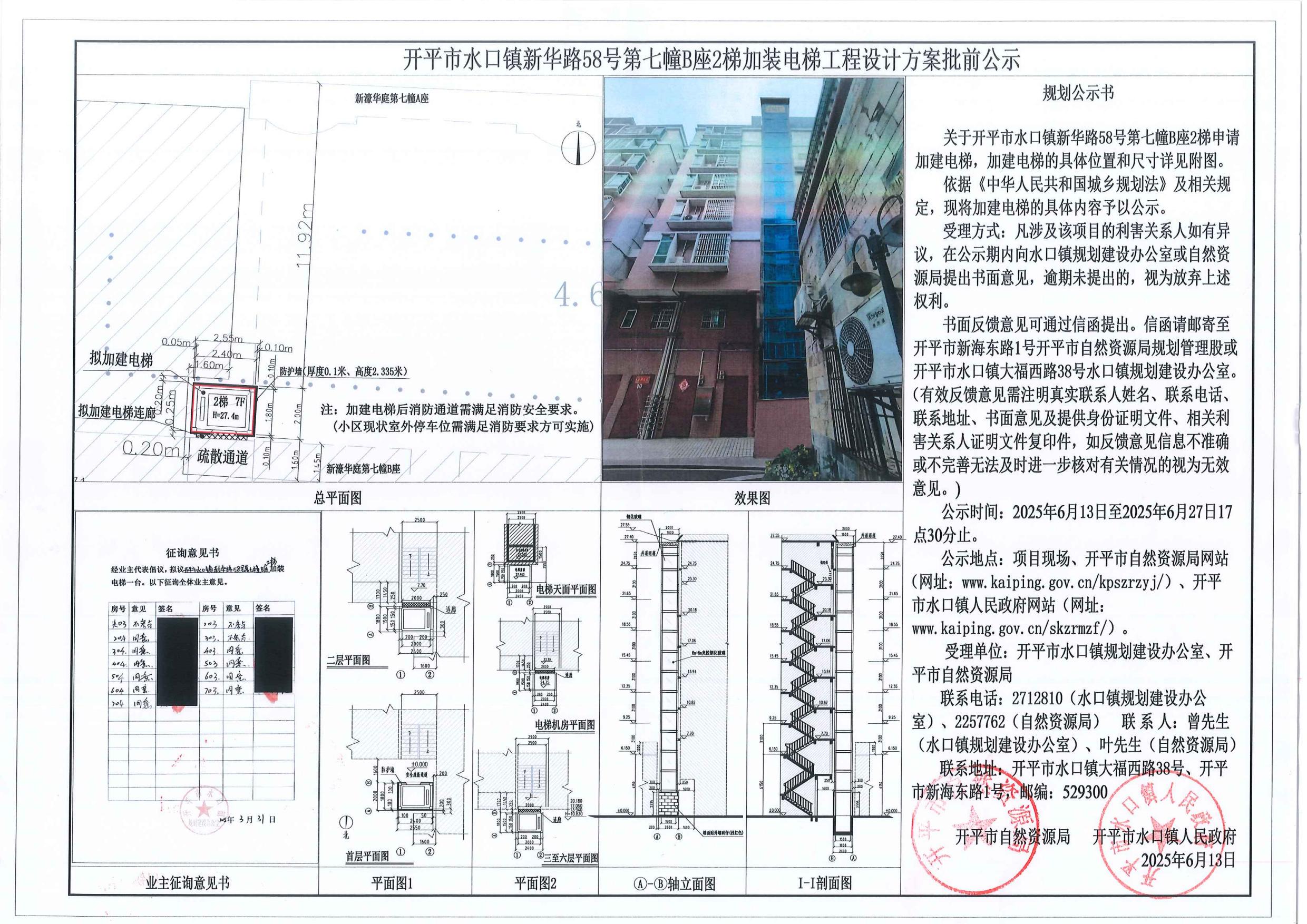 關(guān)于開平市水口鎮(zhèn)新華路58號第七幢B座2梯申請加建電梯,加建電梯的具體位置和尺寸詳見附圖。