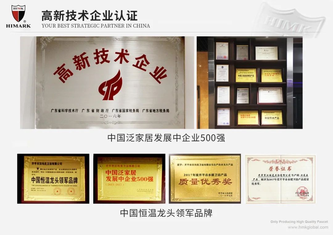 漢瑪克堅(jiān)持以一流的技術(shù)、一流的設(shè)計(jì)、一流的工藝鑄就一流的產(chǎn)品、創(chuàng)造一流的品牌,取信于廣大客戶(hù),產(chǎn)品暢銷(xiāo)全球40多個(gè)國(guó)家,先后榮獲“中國(guó)泛家居發(fā)展中企業(yè)500強(qiáng)”“中國(guó)恒溫龍頭領(lǐng)軍品牌”“中國(guó)十大五金龍頭品牌”中國(guó)節(jié)水產(chǎn)品”“中國(guó)工程建設(shè)推薦產(chǎn)品”等榮譽(yù)稱(chēng)號(hào)。